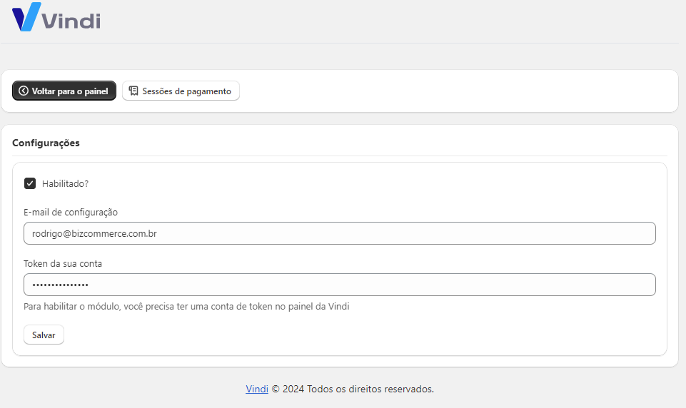 Após instalar, **habilite **o método de pagamento, informe e-mail e **token **de sua conta Vindi Pagamentos e salve.